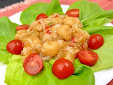油調した一口サイズのカジキと野菜を酸味と甘みのバランスが良くコクもある黒酢と和えました。